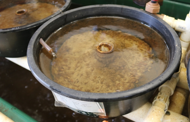 A close-up of one of the rearing pans showing the stand-pipe and circular water flow. Photo: Matthew Patterson, USFWS.