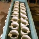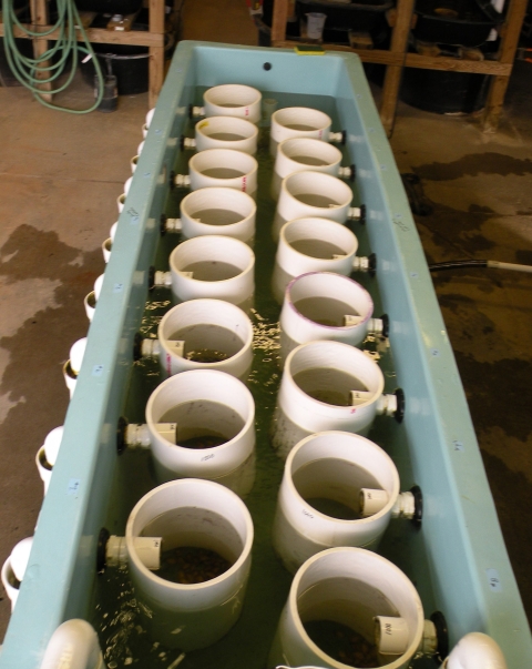 The recirculating tank upweller at White Sulphur Springs National Fish Hatchery. Water and food are pumped into the main fiberglass tank, upwell through the 12 inch PVC culture chambers, exit out the side drain, and return to the sump. Photo: Rachel Mair, USFWS.