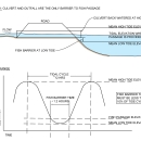 A longitudinal profile showing a road situated next to a tidal water body. A culvert is constructed through the road and water is flowing through the culvert. The culvert is a fish passage barrier at low tide and is back watered at high tide. The title elevation where fish passage is required is shown within the culvert. Below the title profile is a graph depicting elevation on the vertical axis and time on the horizontal axis the tidal range elevation is shown as a sinusoidal curve with a full tidal cycle depicted. The fish barrier time must be less than 10% of the tidal cycle or less than 1.2 hours in a 12-hour period.