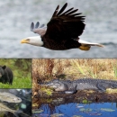 Clockwise from top: a bald eagle, an American alligator, Oregon chubs and a Louisiana black bear.