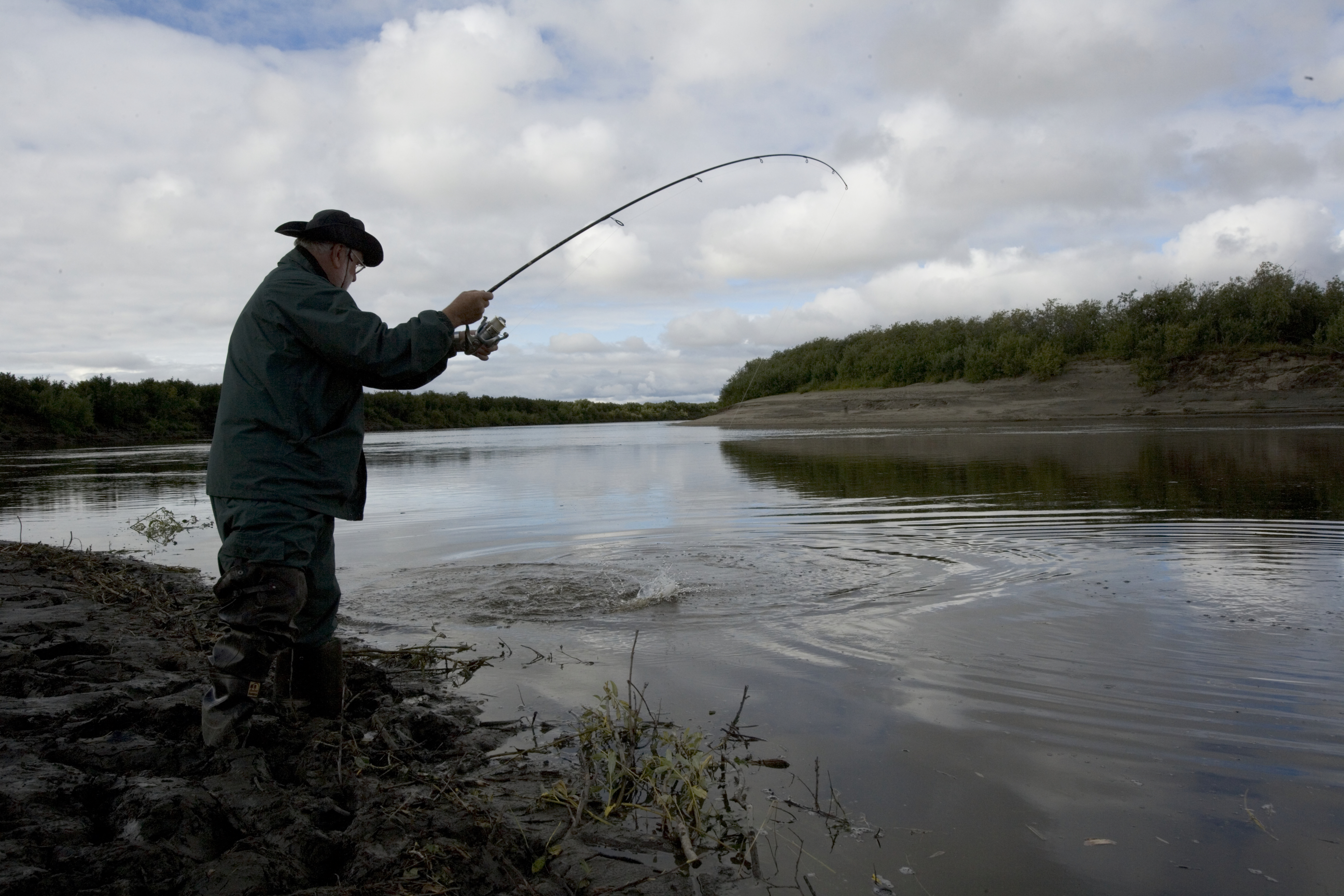 Fisherman is reeling in his catch.