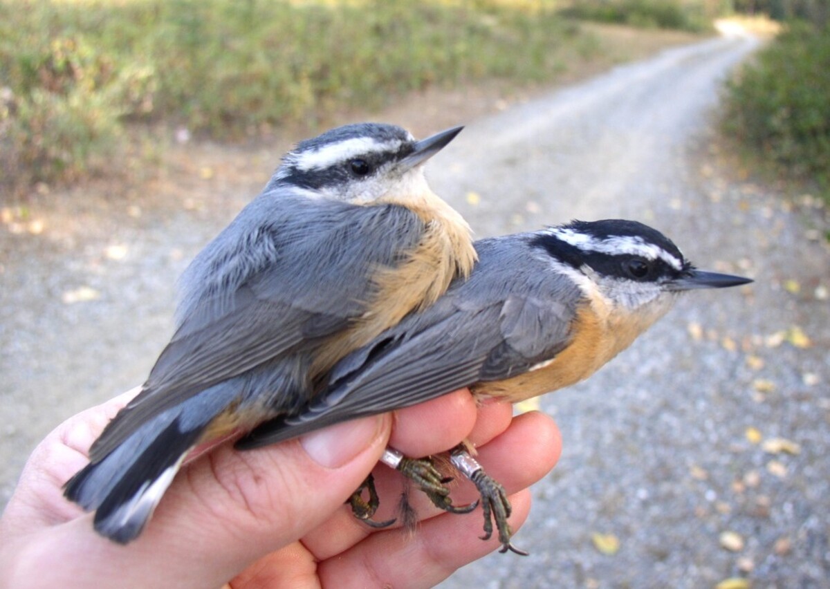 Red-breasted Nuthatch juvenile and adult in hand