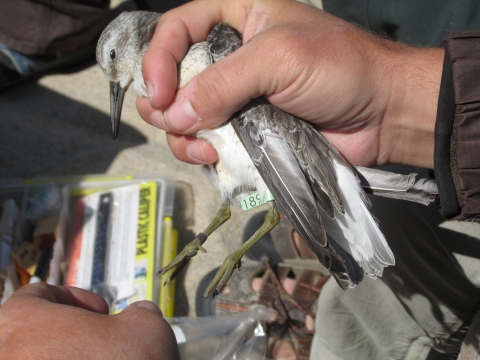 Red knot cannon netting in Cape Cod. This juvenile red knot has just received a Bird Banding Laboratory metal band with a unique number and an alpha-numeric flag that is also uniquely coded. The lime green color of the flag means it was banded in the U.S.