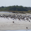 A flock of red knots on a beach shows how difficult it can be to read flags. Transmitters provide important insight when reading bands is difficult.
