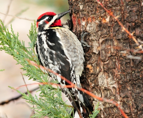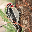 Sapsuckers do not suck sap, but are specialized for sipping it. Their tongues are shorter than those of other woodpeckers, and do not extend as far out. The tip of the tongue has small hair-like projections on it that help pick up the sap, much like a paintbrush holds paint. Sap wells made by sapsuckers attract other sap feeders, especially hummingbirds. This red-naped sapsucker was making sap wells in a juniper trunk near refuge headquarters.