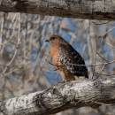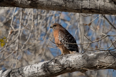 A Red-shouldered Hawk is typically a sign of tall woods and water. It’s one of our most distinctively marked common hawks, with barred reddish-peachy underparts and a strongly banded tail.