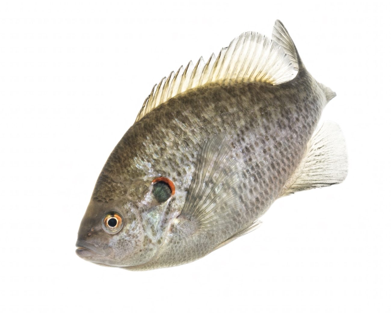 Deep bodied, olive colored, with darker spots and flecks of red, and occasionally vertical bars along the sides. The hind end of the gill flap is black with a white border and has a red spot on the tip, hence its name.