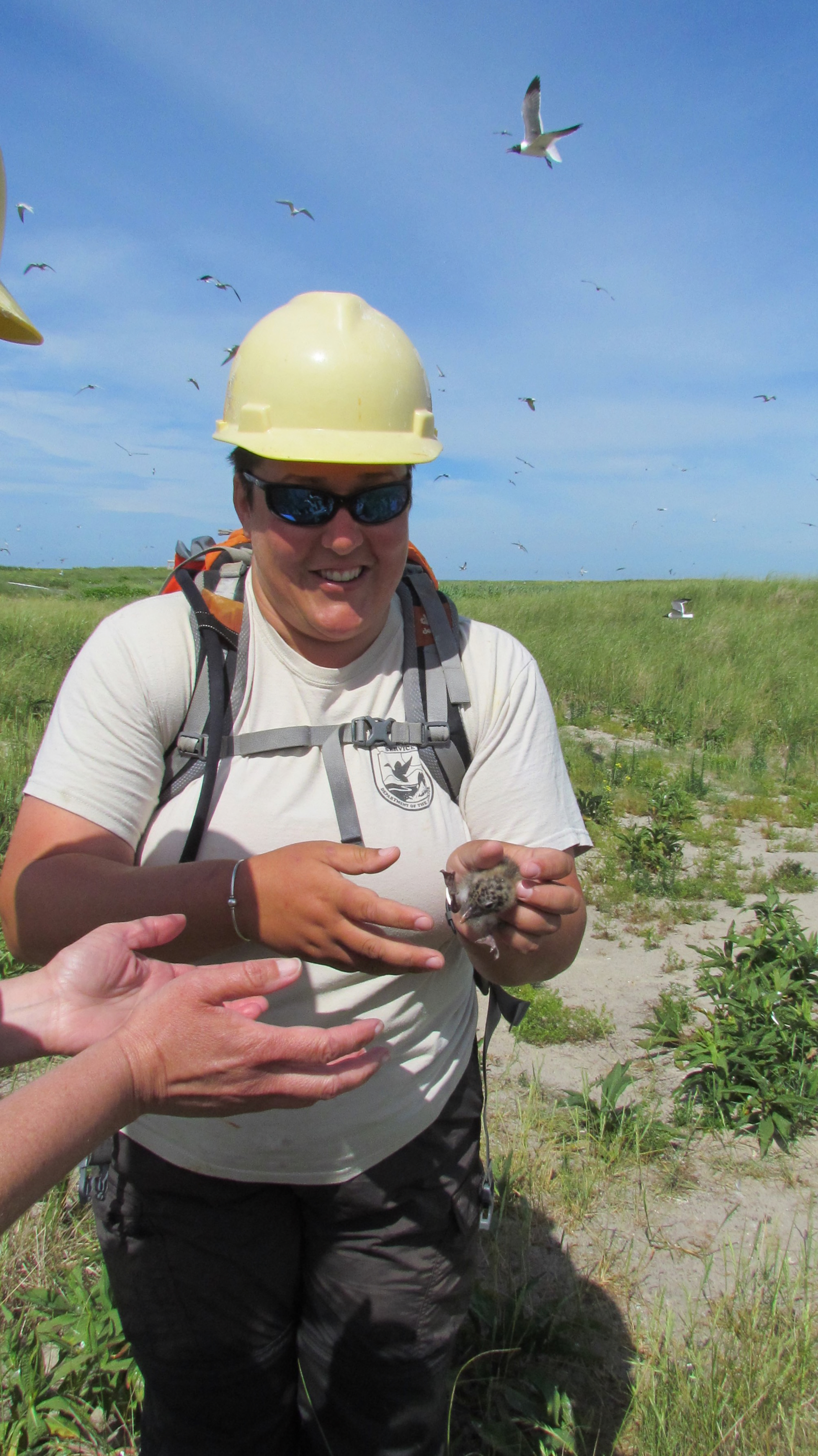 Refuge Biologist, Kate Iaquinto, holds a Laughing gull chick.