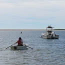 Refuge Biologist rows to another U.S. Fish and Wildlife Service boat