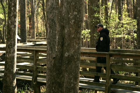 FWS Employee enjoys a stroll on a refuge boardwalk.