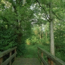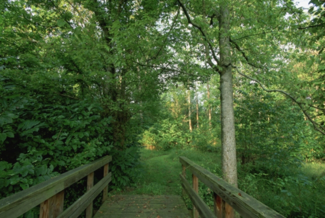 A portion of one of the foot trails with a pedestrian bridge.