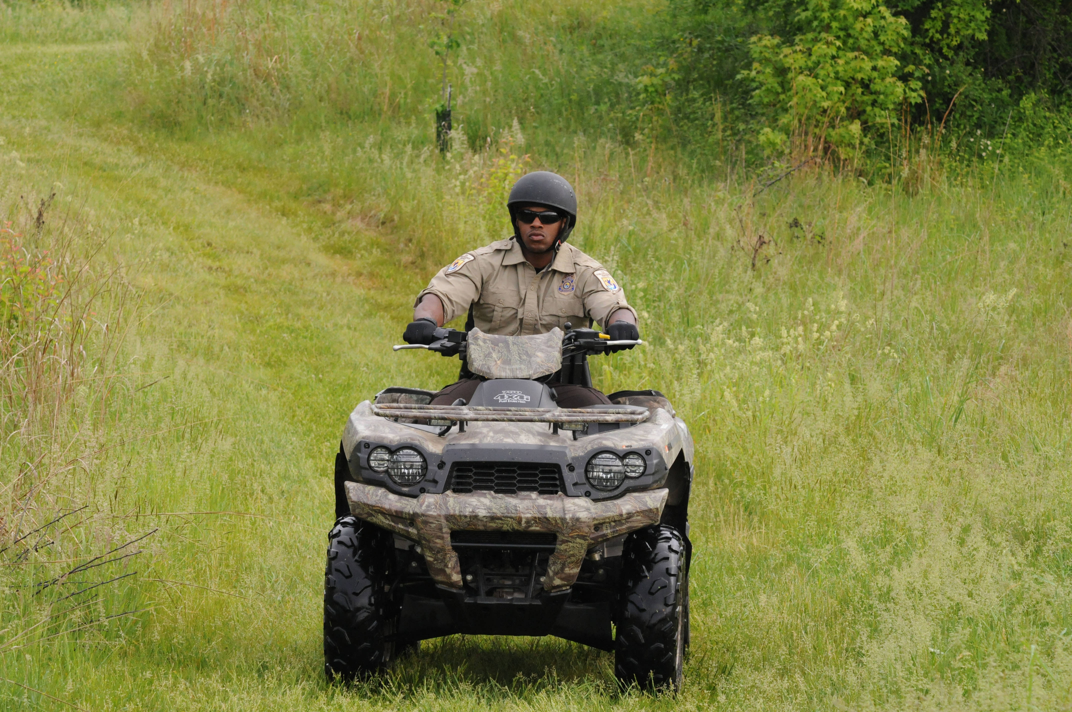 Refuge LE officer, Gabriel Harper, on patrol using an All-terrain vehicle.