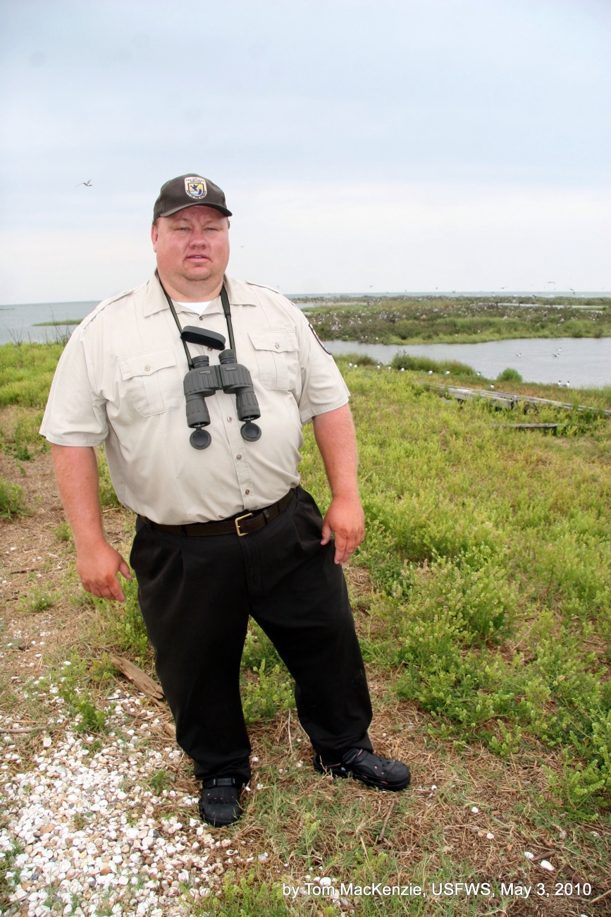 Refuge Manager Jack Bohannan stands atop Breton National Wildlife Refuge during bird and boom survey.