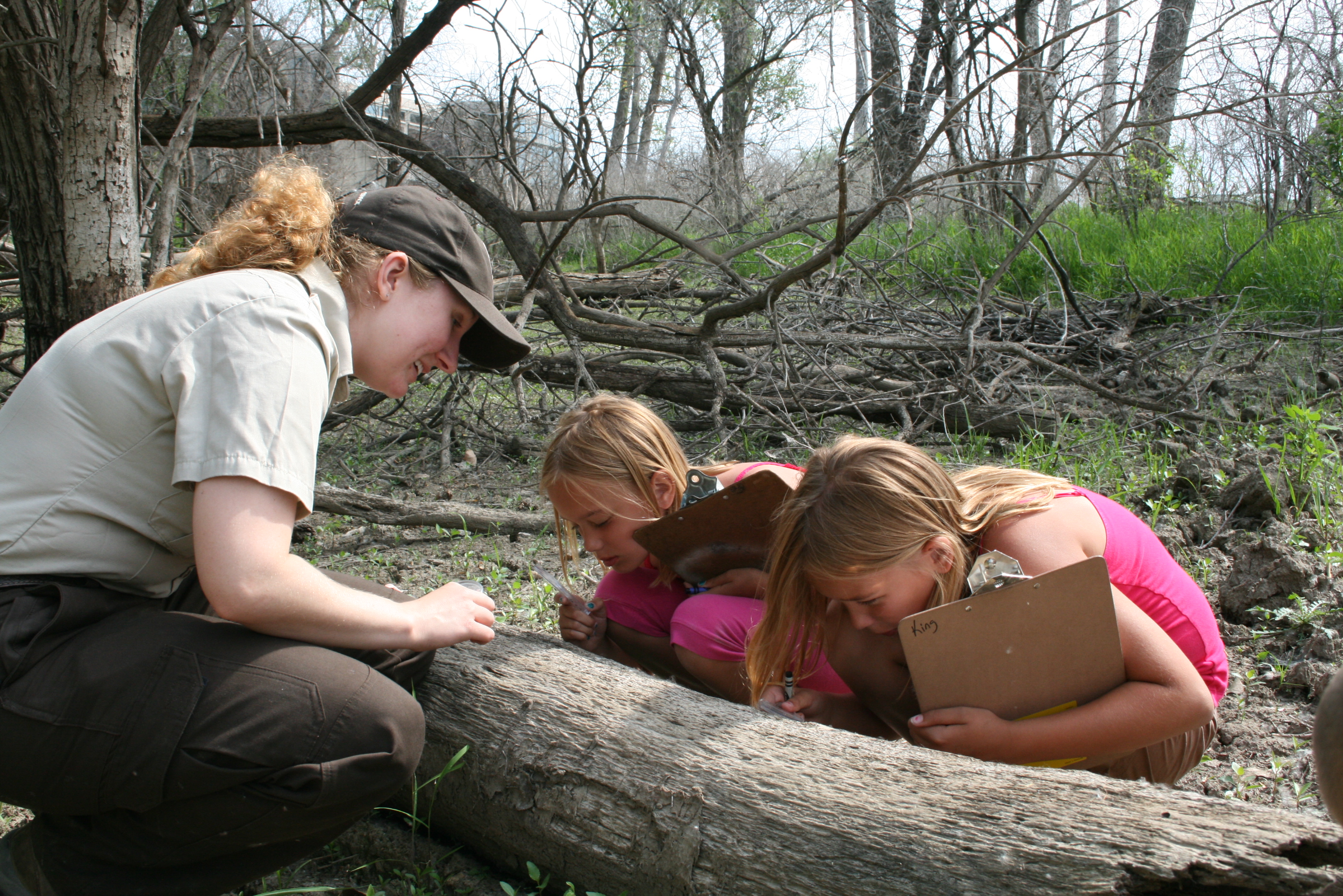A refuge ranger looking at a log with students.