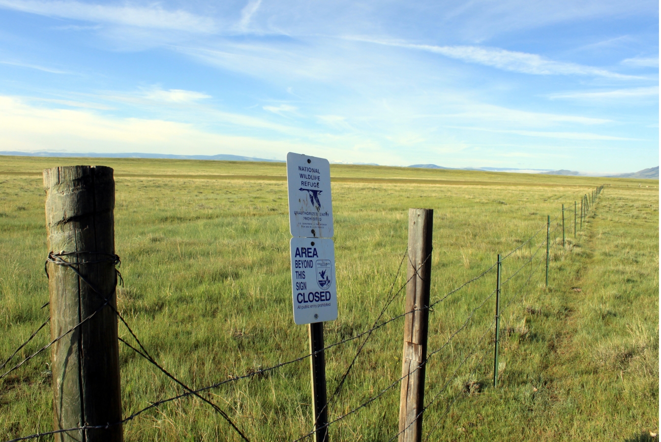 Scenic view of a refuge sign and fence. The refuge is home to North America's most imperiled amphibian: the Wyoming toad.