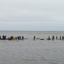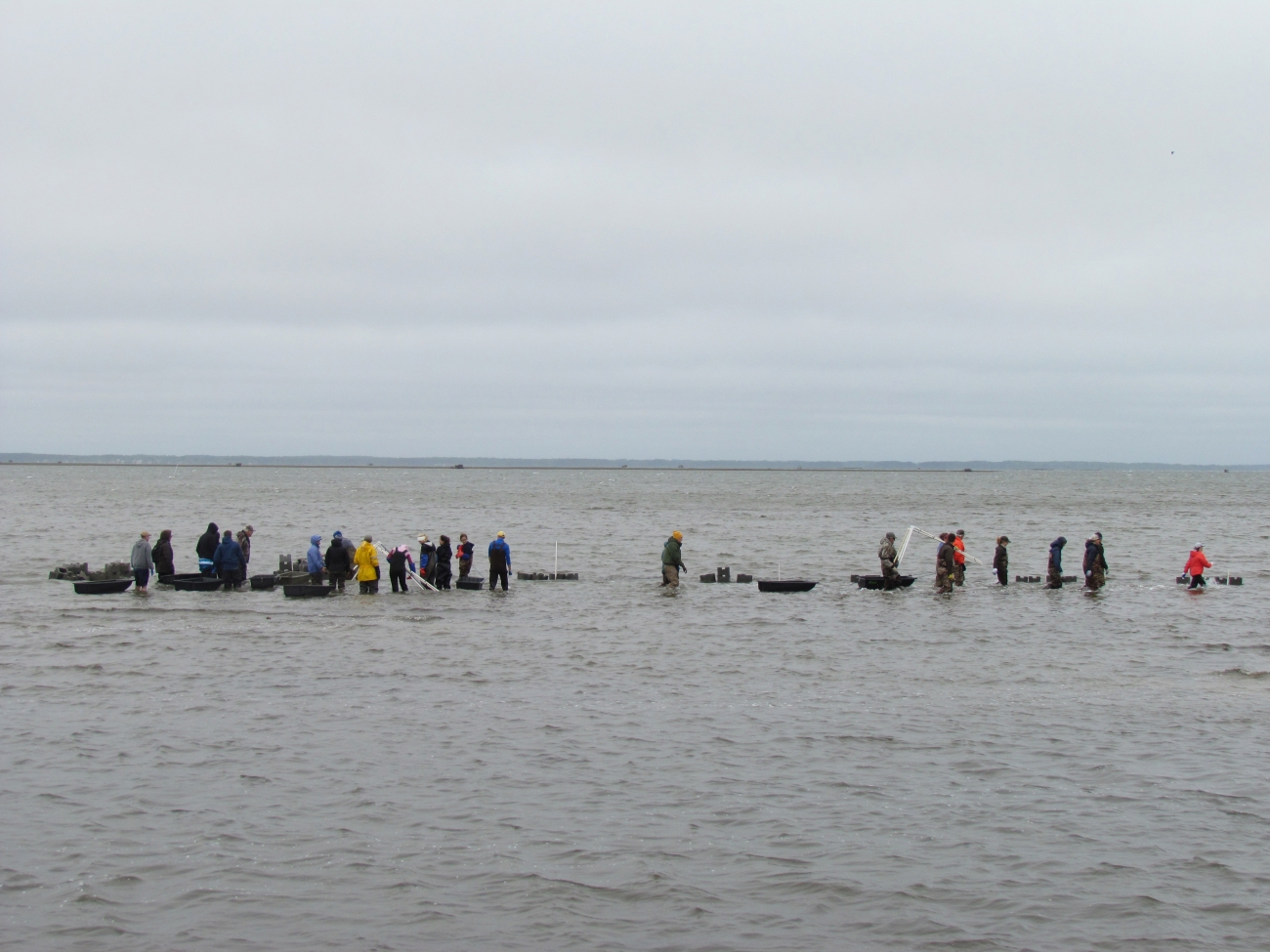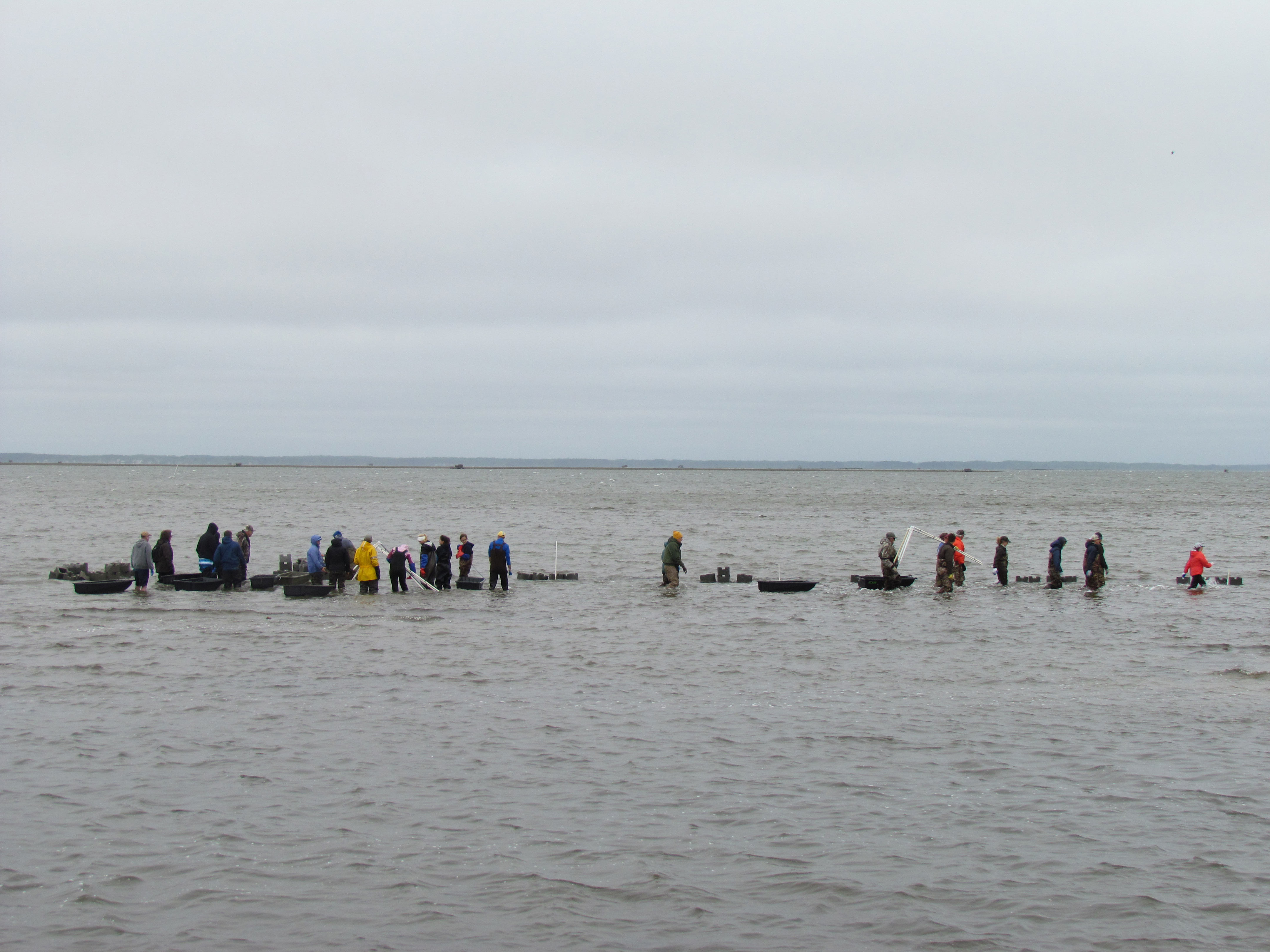 Refuge staff and volunteers and The Nature Conservancy volunteers build oyster castles