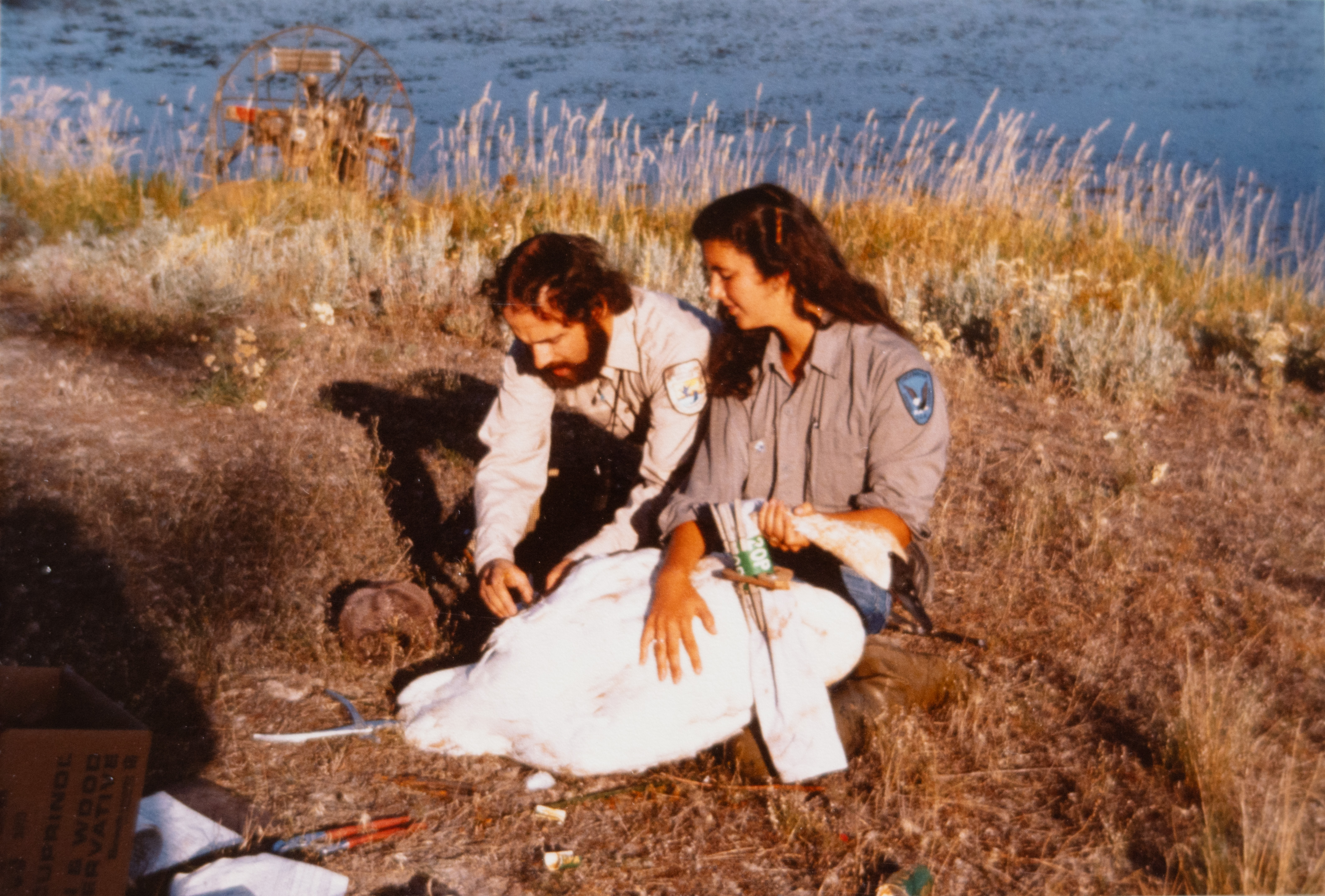 Refuge staff band the last nesting female trumpeter swan part of a struggling reintroduction project that started in the 1960's. The bird later was killed by cayotes while incubating her eggs in 1988. Her mate was dubbed "Solo" as he spent 21 years mostly alone after her death.