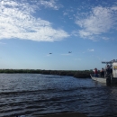 Airboat staff from Bayou Sauvage National Wildlife Refuge watches the helicopters fly by. The helicopters are on their way to pick up bundles of trees.