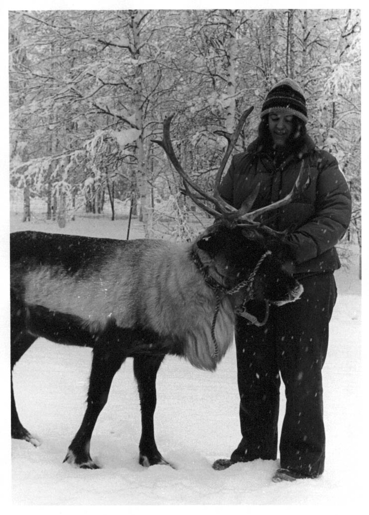 Karma Krelle, YACC, holds tame reindeer at the University of Alaska Fairbanks; The reindeer is used in a caribou forage evaluation study. ARLIS; Alaska; FWS-797;