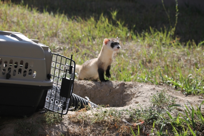 A black footed ferret kit named Noodle released into the pre-conditioning pen at F.E. Warren Air Force Base.