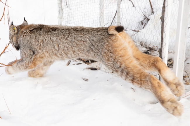 A released lynx stretches into a bound. Lynx Project At Yukon Flats National Wildlife Refuge.