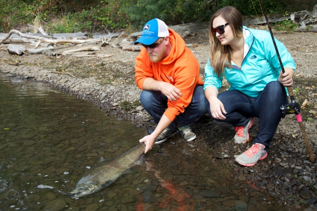 Anglers on shore release a Fall Chinook salmon into the Columbia River. Pacific Northwest Fisheries.
