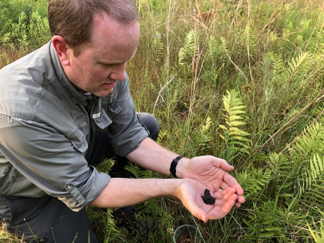 Thomas "Tom" McCoy, USFWS Field Supervisor, readying to release a gopher frog cupped in his hands. Photo by Melanie Olds, USFWS biologist at Francis Marion National Forest, June 6, 2019.
