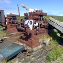 The rusted remains of two engine generators sit exposed in a field.