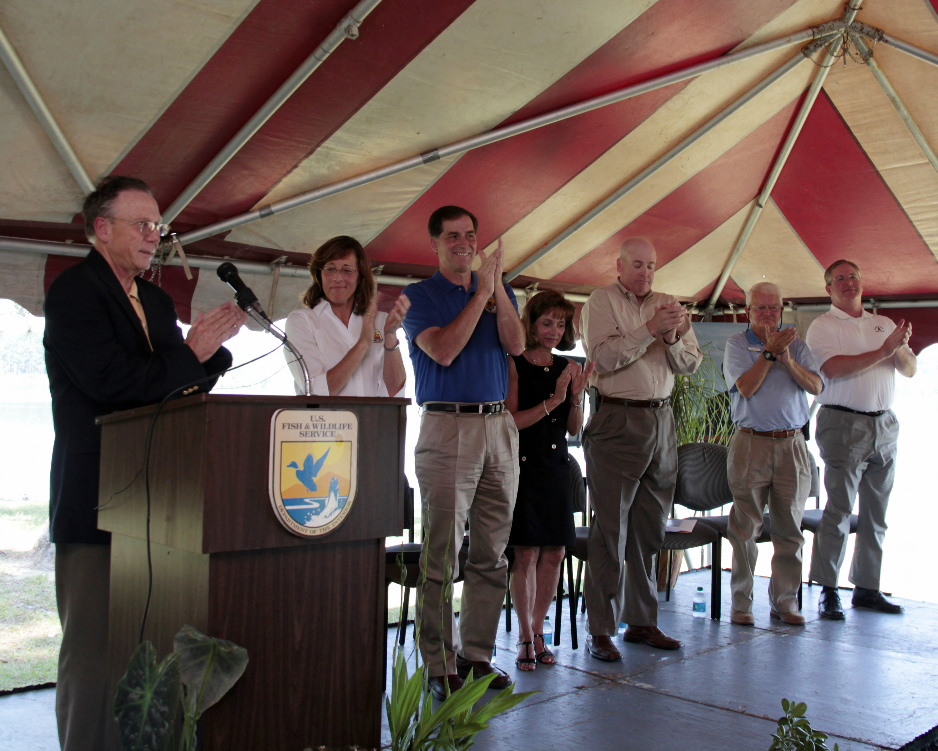 Dr. Richard M. Kaminski, Mississippi State University, (l) finishes reading a resolution honoring Sam Hamilton with a round of applause. (then – left to right) Speakers Cindy Dohner, Southeast Regional Director, Dan Ashe, Director, U.S. Fish and Wildlife Service, Becky Hamilton (the late Sam Hamilton’s wife), Greg Knadle, Director of Congressional Relations, National Fish and Wildlife Foundation, Chip Reynolds, District Director for Congressman Gregg Harper, Chris Richardson State Field Representative for U.S. Senator Thad Cochran