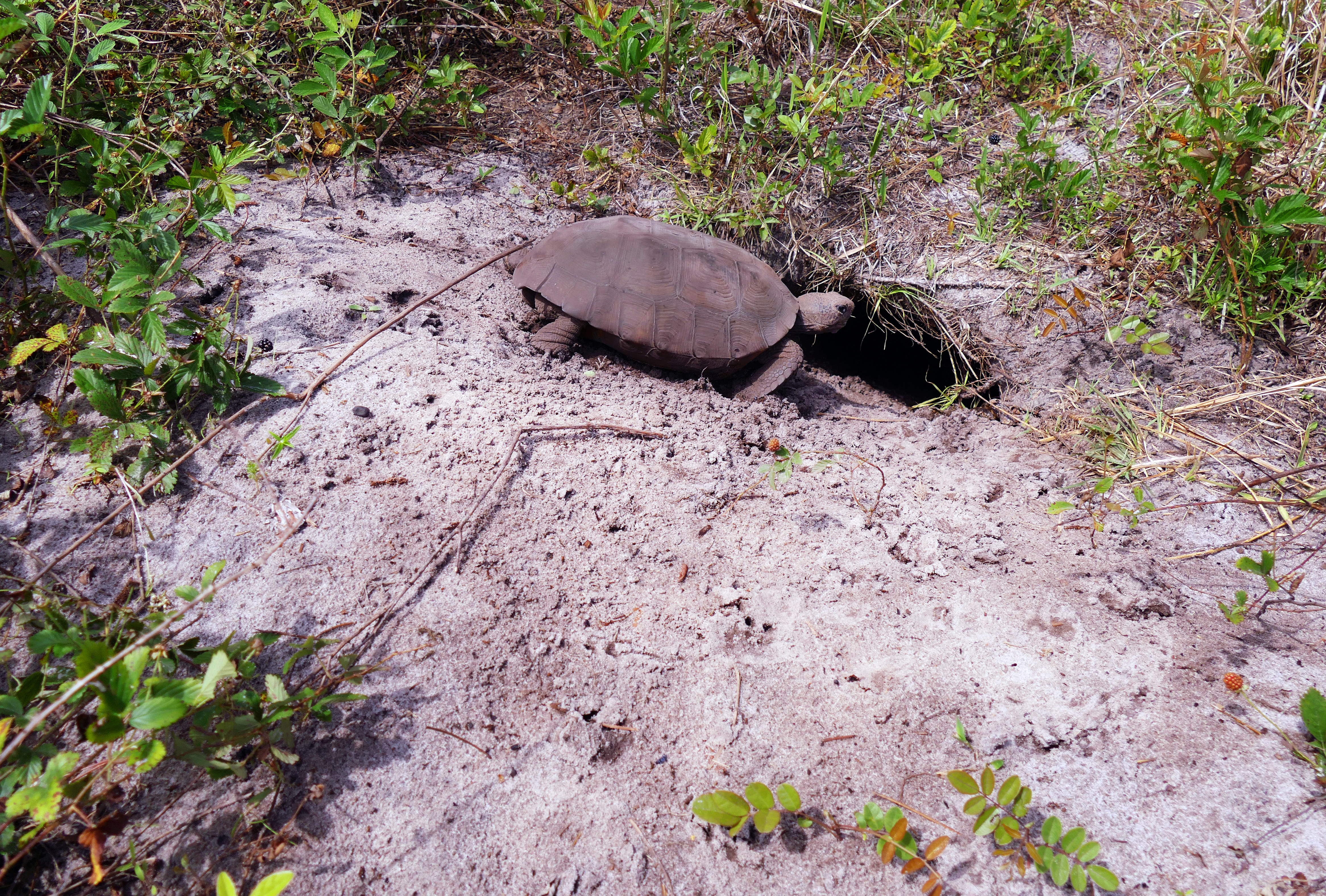A gopher tortoise enters its burrow