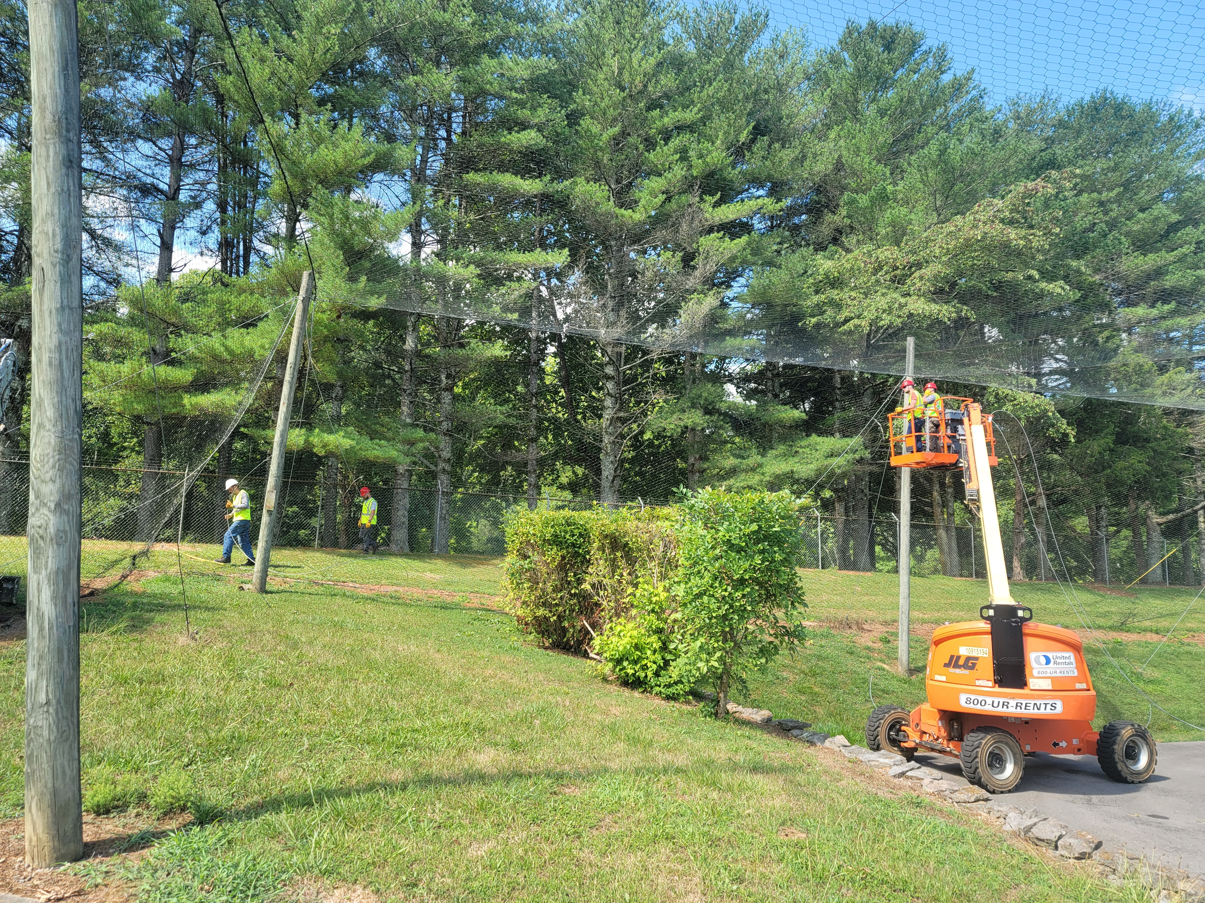 Repairs to damaged netting at Dale Hollow National Fish Hatchery in Tennessee start by securing the hazardous leaning poles and replacing anchors that have been pulled from the ground.