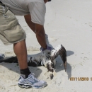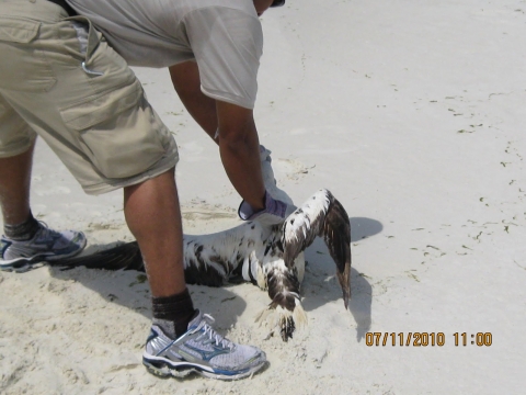 July 11, 2010 Destin, FL - A Northern Gannet with no visible oil was rescued near Destin Harbor, FL. Day One of deployment is "training day". Employees are provided thorough orientation and training in the safe handling of wildlife and evidence. Photo by USFWS.