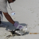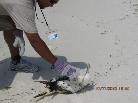 July 11, 2010 Destin, FL - A Northern Gannet with no visible oil was rescued near Destin Harbor, FL. The bird could not fly, but had no visible oil. Photo by USFWS.