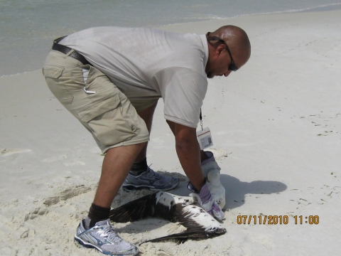 July 11, 2010 Destin, FL - A Northern Gannet with no visible oil was rescued near Destin Harbor, FL. Rescuer Kenan Adams works for Carolina Sandhills National Wildlife Refuge and is a student at Clemson University. Photo by USFWS.