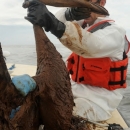 "JEFFERSON PARISH, La. – Jeff Phillips, Environmental Contaminants Coordinator for the U.S. Fish and Wildlife Service, rescues a Brown Pelican from the Barataria Bay in Grand Isle, La., June 4, 2010. State and federal wildlife services pulled approximately 60 Brown Pelicans, in the last two days, covered in oil from the Barataria Bay area. U.S. Coast Guard photo by Petty Officer 3rd Class Ann Marie Gorden."