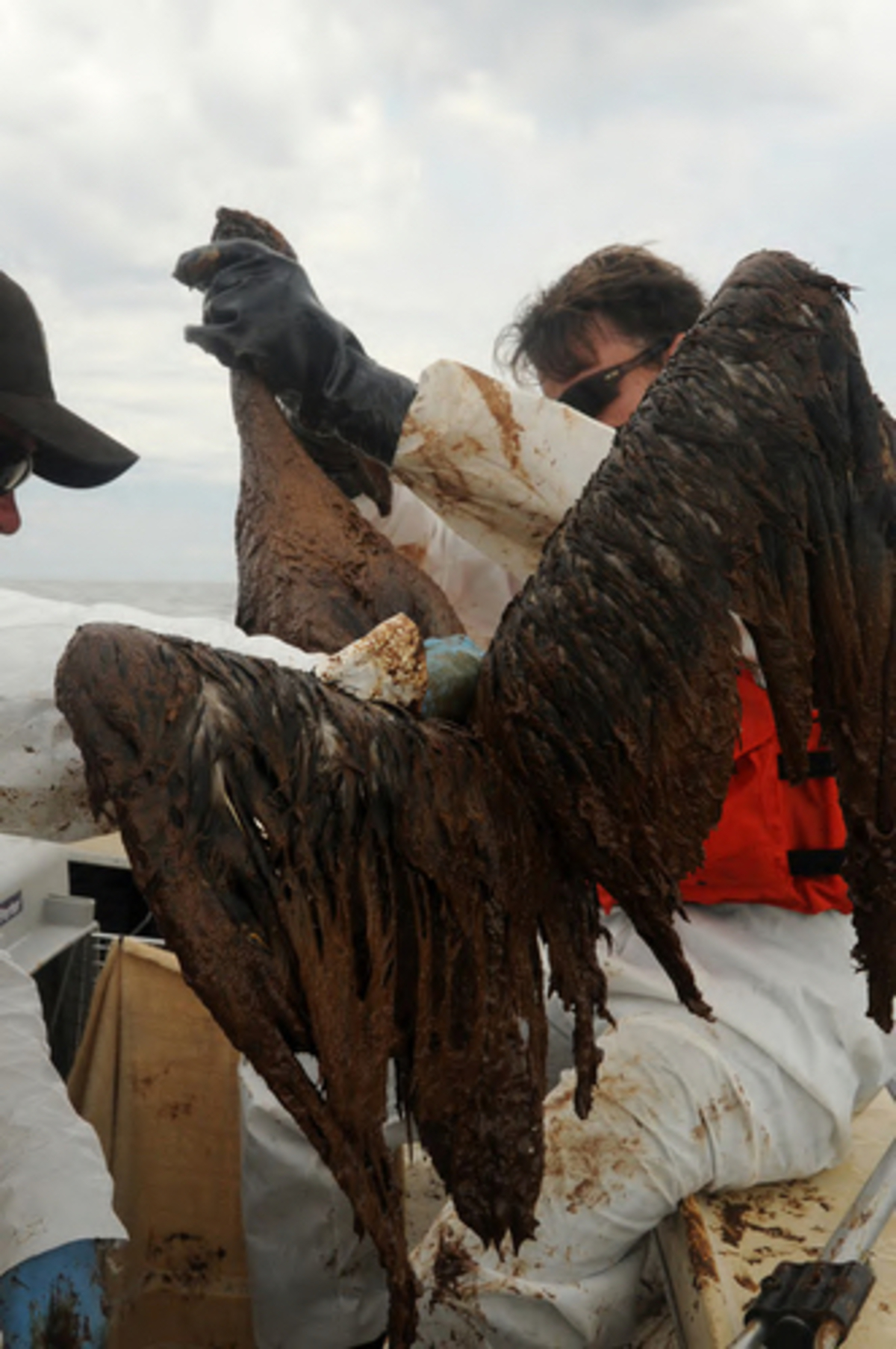 "JEFFERSON PARISH, La. – Jeff Phillips, Environmental Contaminants Coordinator for the U.S. Fish and Wildlife Service, rescues a Brown Pelican from the Barataria Bay in Grand Isle, La., June 4, 2010. State and federal wildlife services pulled approximately 60 Brown Pelicans, in the last two days, covered in oil from the Barataria Bay area. U.S. Coast Guard photo by Petty Officer 3rd Class Ann Marie Gorden."