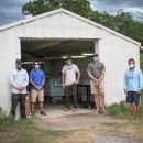 A team of researchers from Texas A&M AgriLife Research visited Inks Dam National Fish Hatchery July 28, 2020 to collect hatchery-raised juvenile mussels as part of a project funded by U.S. Fish and Wildlife Service Ecological Services. The team is studying how the extreme low and high flows that plague the San Saba River impact populations of rare mussel species and how climate change might exacerbate their struggle to survive. From left to right: Amanda Goldsmith (Texas A&M), Alex Kiser (Texas A&M), Scott Walker (USFWS), Gary Pandolfi (USFWS), Bailey Gaines (USFWS), Dr. Charles Randklev (Texas A&M) and Xenia Rangaswami (Texas A&M). (Photo: Aubry Buzek/USFWS)