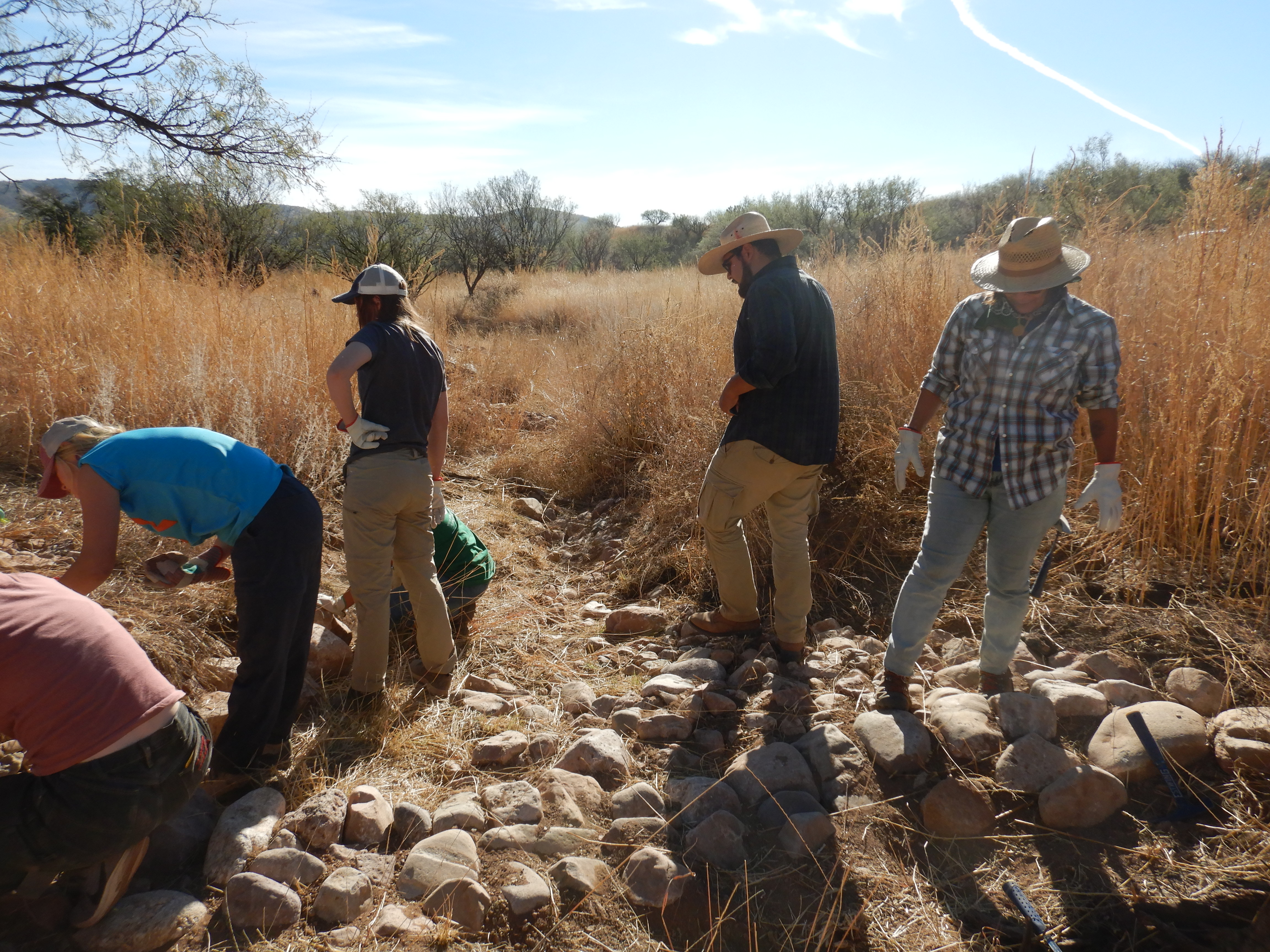 Volunteers build erosion control structures in an ephemeral stream on a sunny morning in the Borderlands Wildlife Preserve.