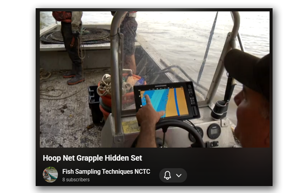Retrieval in moderate current, hidden set, no float, small hoop net boat maneuvering by driver, grappling technique