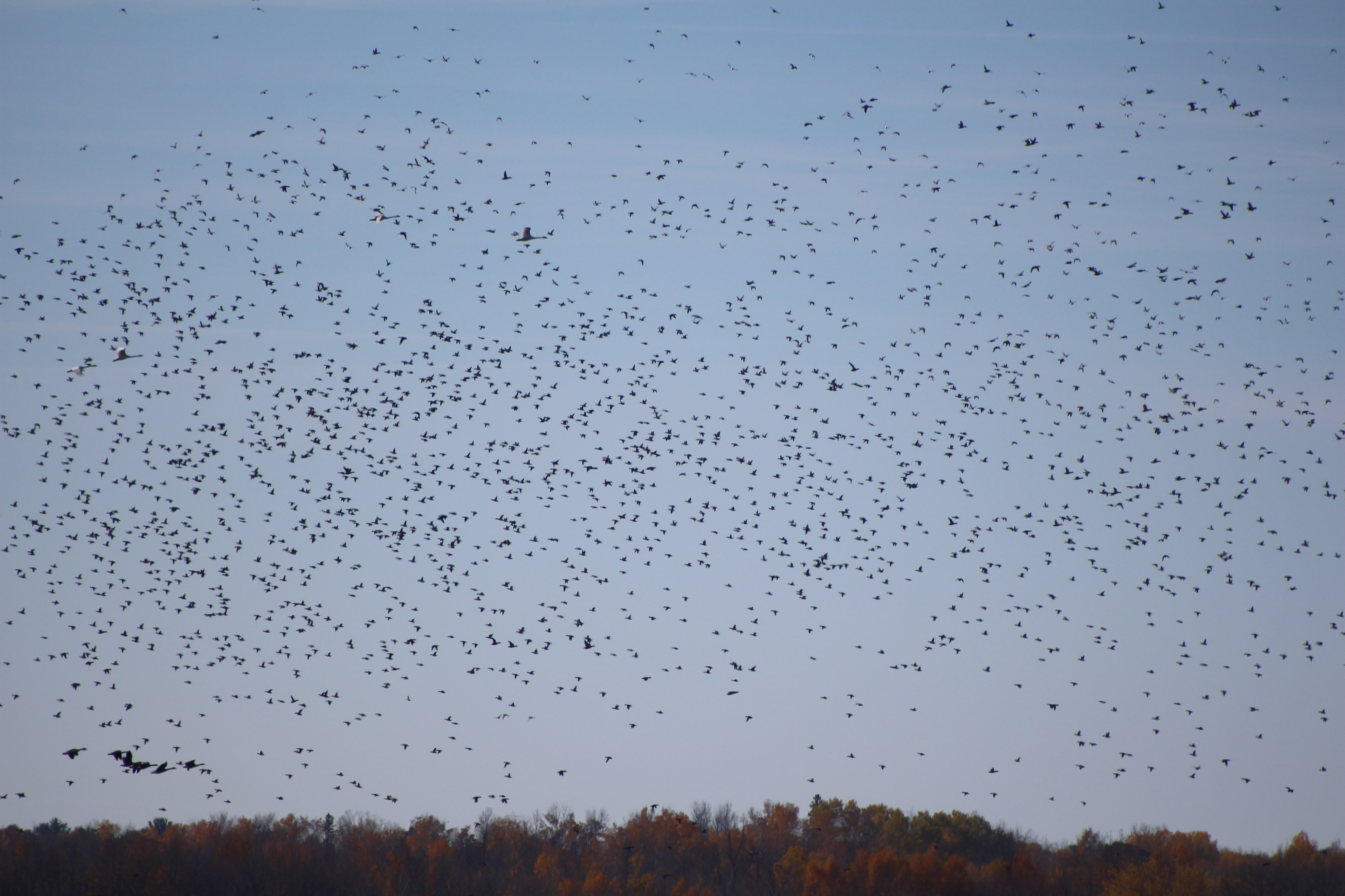 Waterfowl in flight above Rice Lake. Large numbers of ducks, primarily ring-necked ducks, gather at the refuge in the fall. This photo was taken in 2017 when the state record of number of ring-necked ducks in one location was achieved (936,600 or half of the continent's population).
