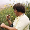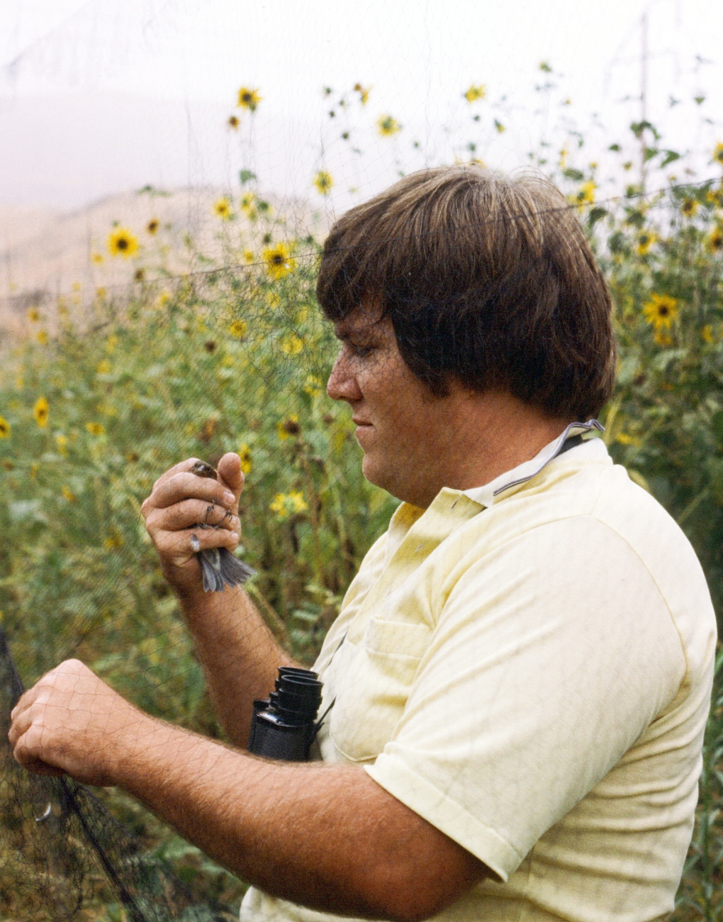 Wildlife biologist and section 7 coordinator Rick Farris banding a grosbeak out of a mist net at a site in San Bernardino County, California in 1981. Rick Farris will retire in March 2018 after two decades with the agency.