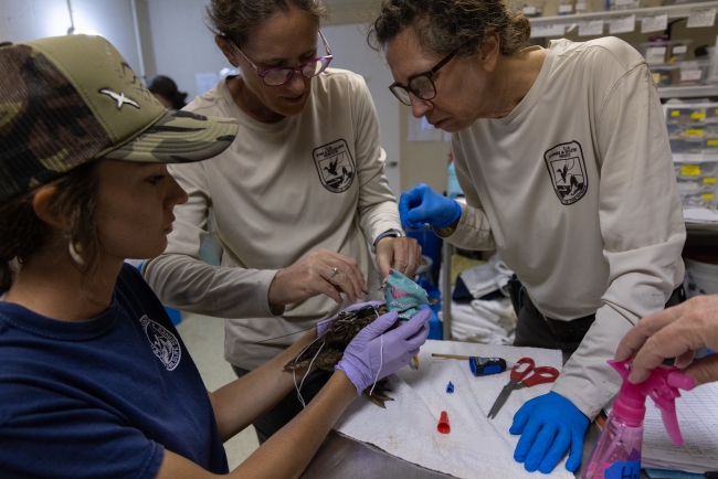 Members of the Duck Team rigging transmitter harnesses on endangered Laysan ducks in the Duck Lab on Midway Atoll National Wildlife Refuge during the Seabird Protection Project.
