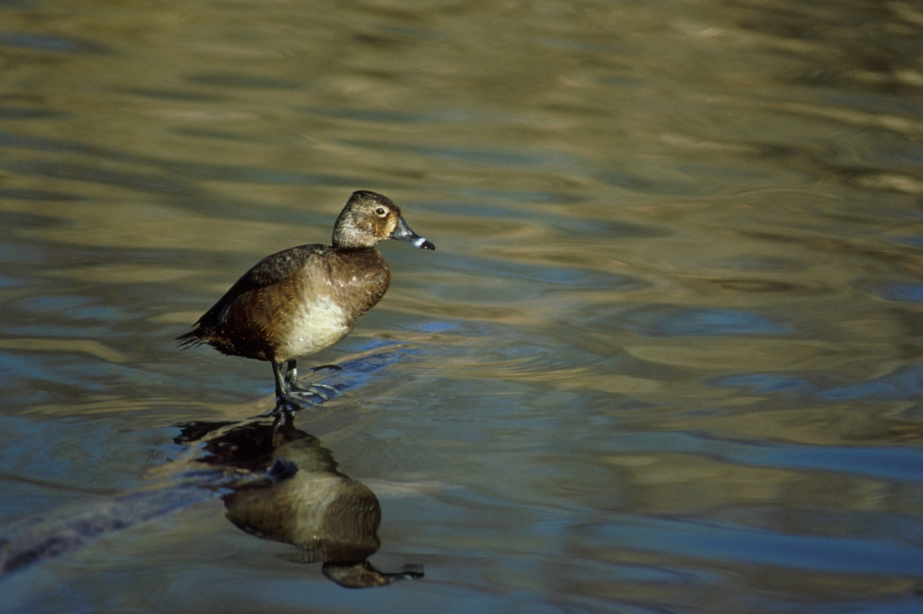 A female Ring-necked Duck stands on a log in the water at the DeSoto National Wildlife Refuge located in Iowa.