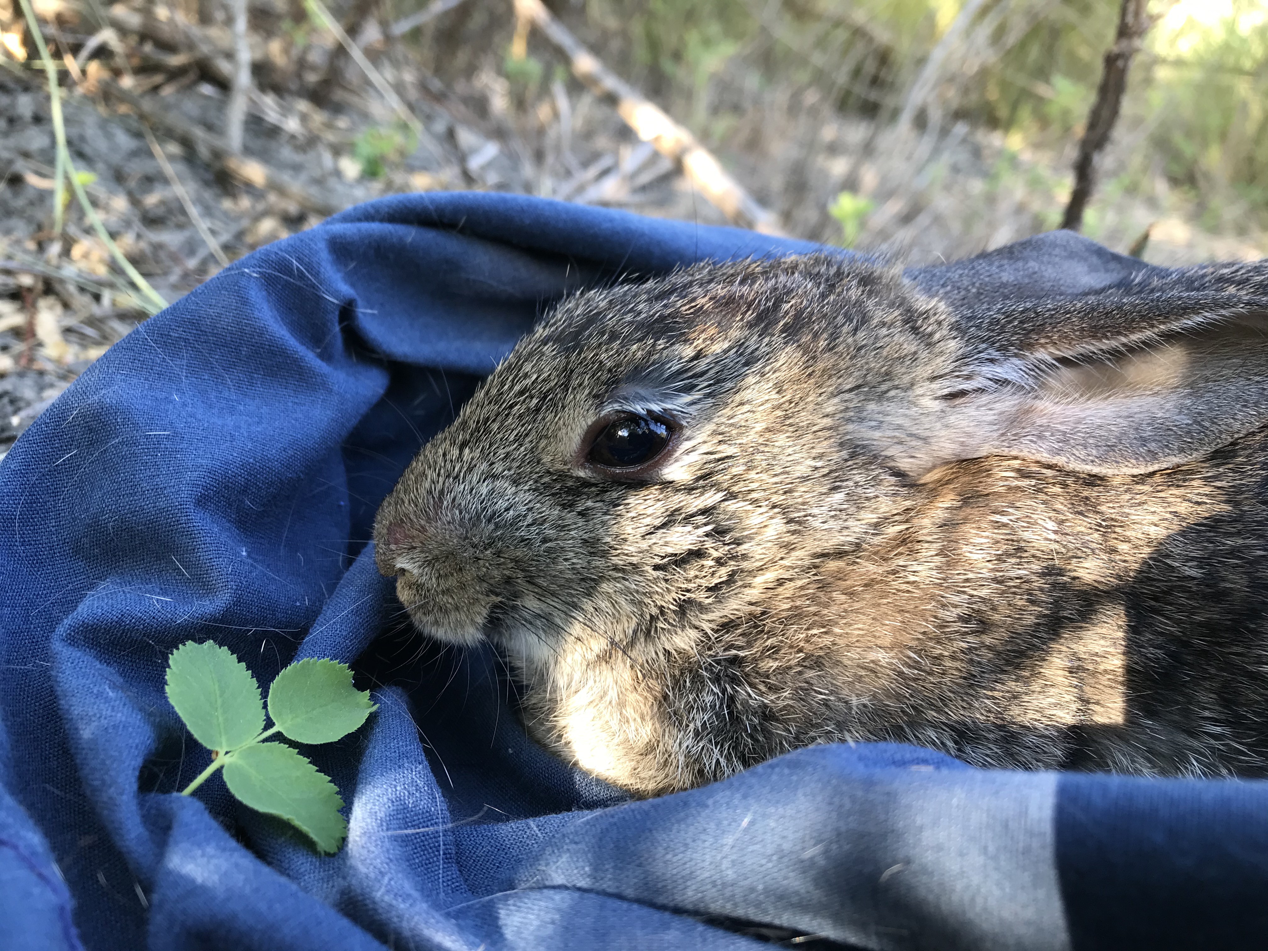 A riparian brush rabbit during vaccination efforts sitting in a holding bag. Credit: USFWS