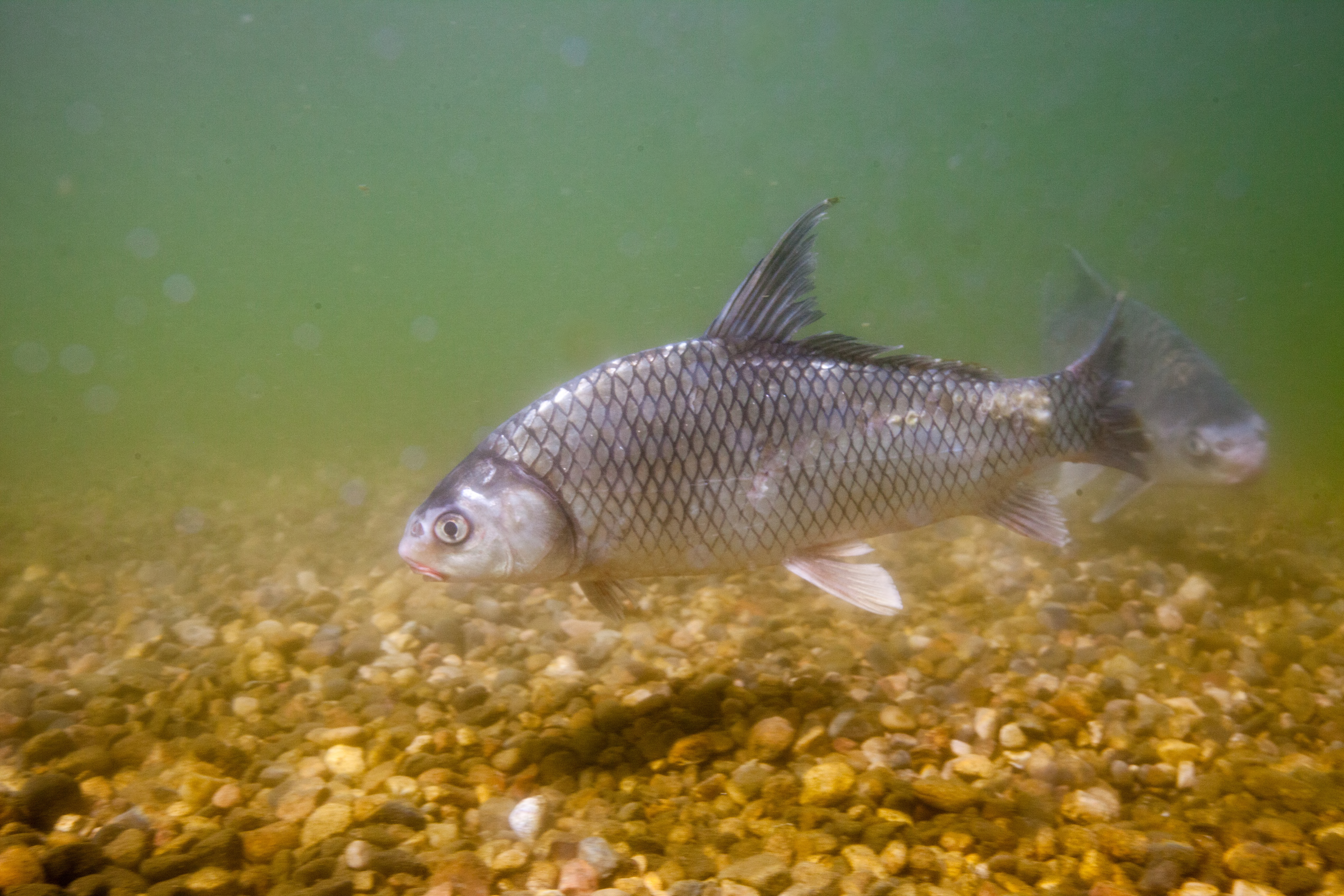 The river carpsucker has a silvery, deep, rather thick body, a long, sickle-shaped dorsal fin, and whitish lower fins. The center of the lower lip has a nipple-like projection.