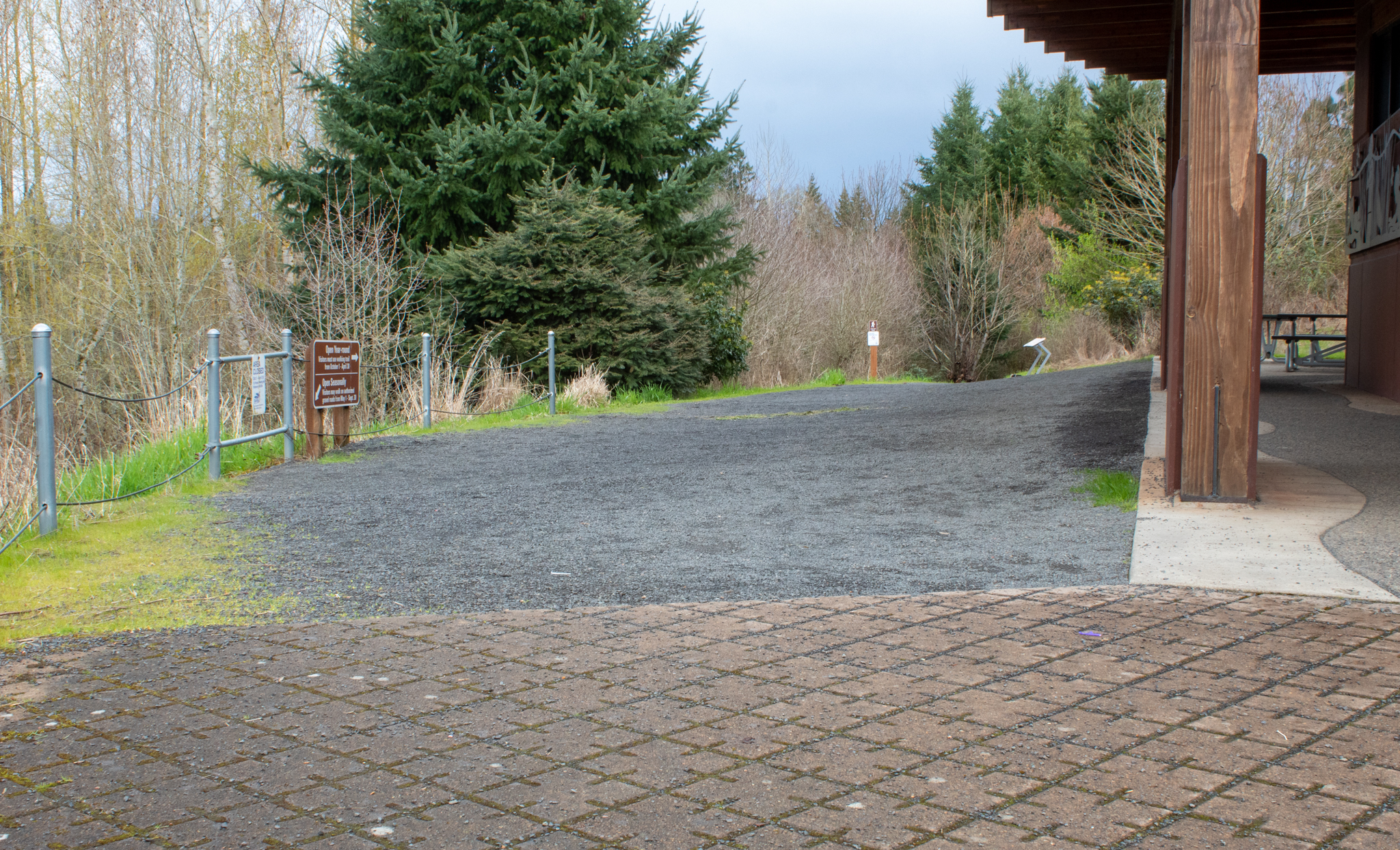 At the beginning of the River Trail, at the Education Shelter, there is a surface transition from hard pavers to small crushed gravel. The transition height between the surfaces is less than one inch.