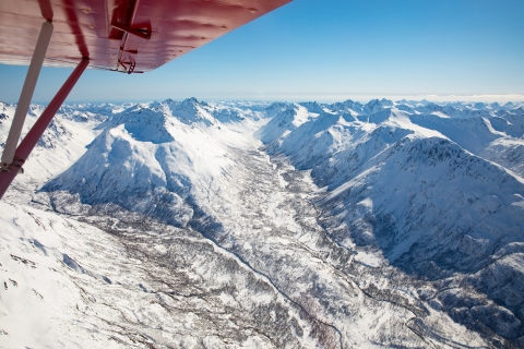 River valleys running out from the main mountain range of Kodiak Island. Aerial view of snow covered mountains at Kodiak NWR in Alaska.