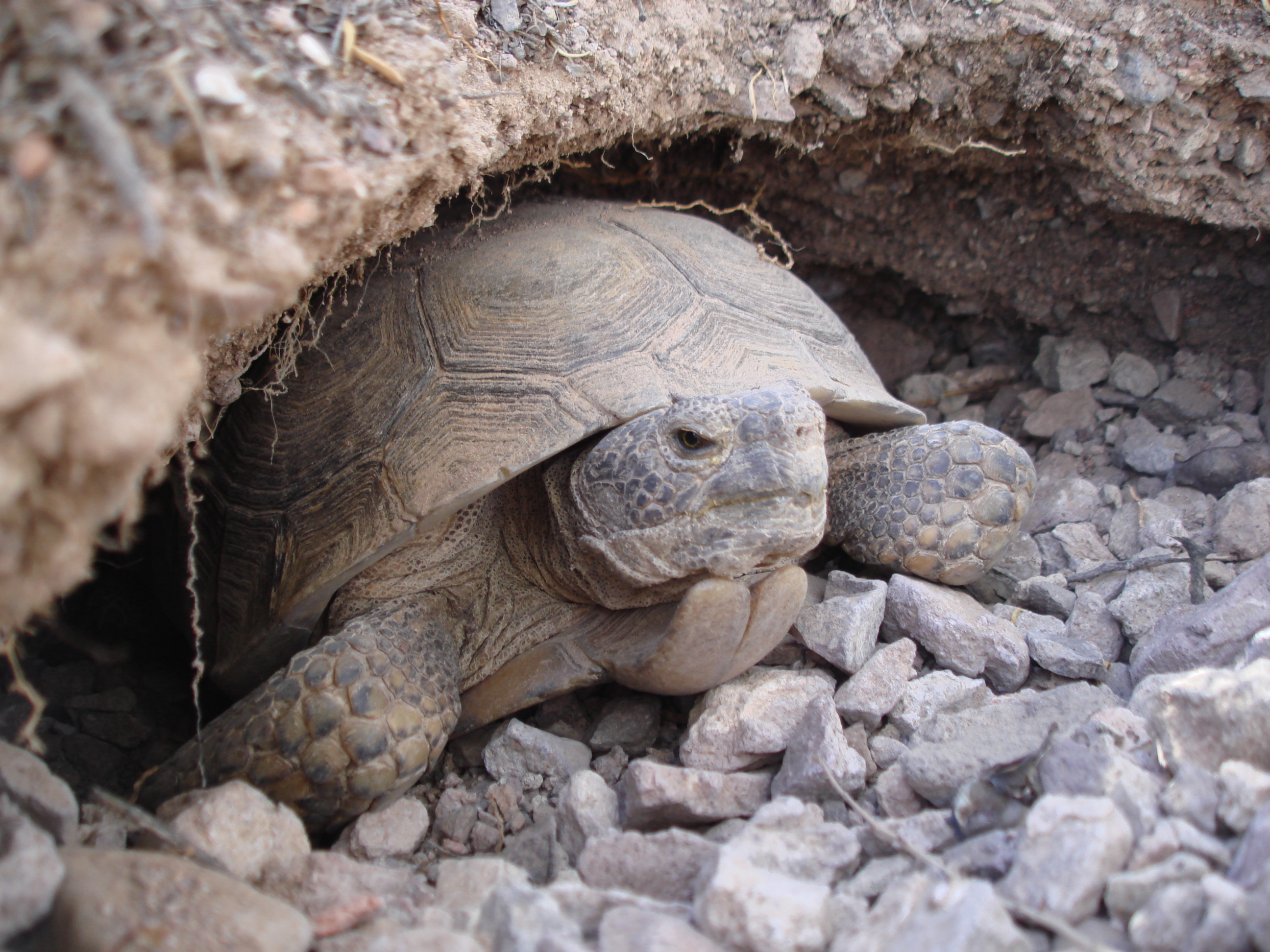 Mojave Desert Tortoise facing out of burrow