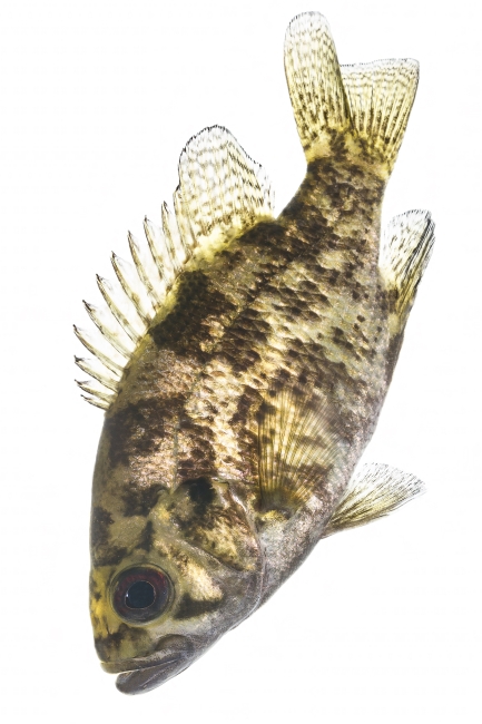 Rockbass can change from light to dark colored very quickly to blend in with their surroundings. They have a large mouth and red eyes. Rockbass have a dark tear drop below their eye.