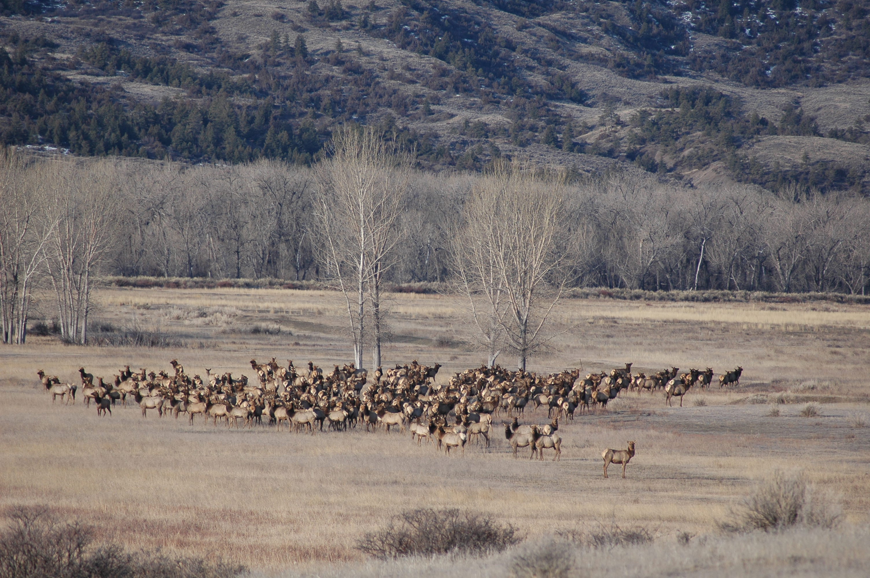 A Rocky Mountain elk herd in a field of Winter Cottonwoods.